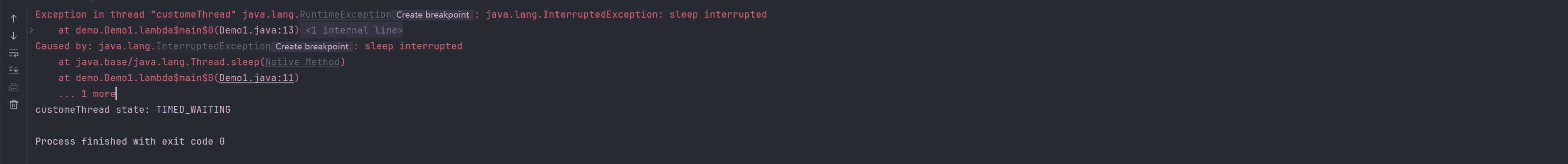 try { Thread.sleep(100); // 打断会抛出异常 thread.interrupt(); } catch (InterruptedException e) { throw new RuntimeException(e); } System.out.println(thread.getName() + " state: " + thread.getState());